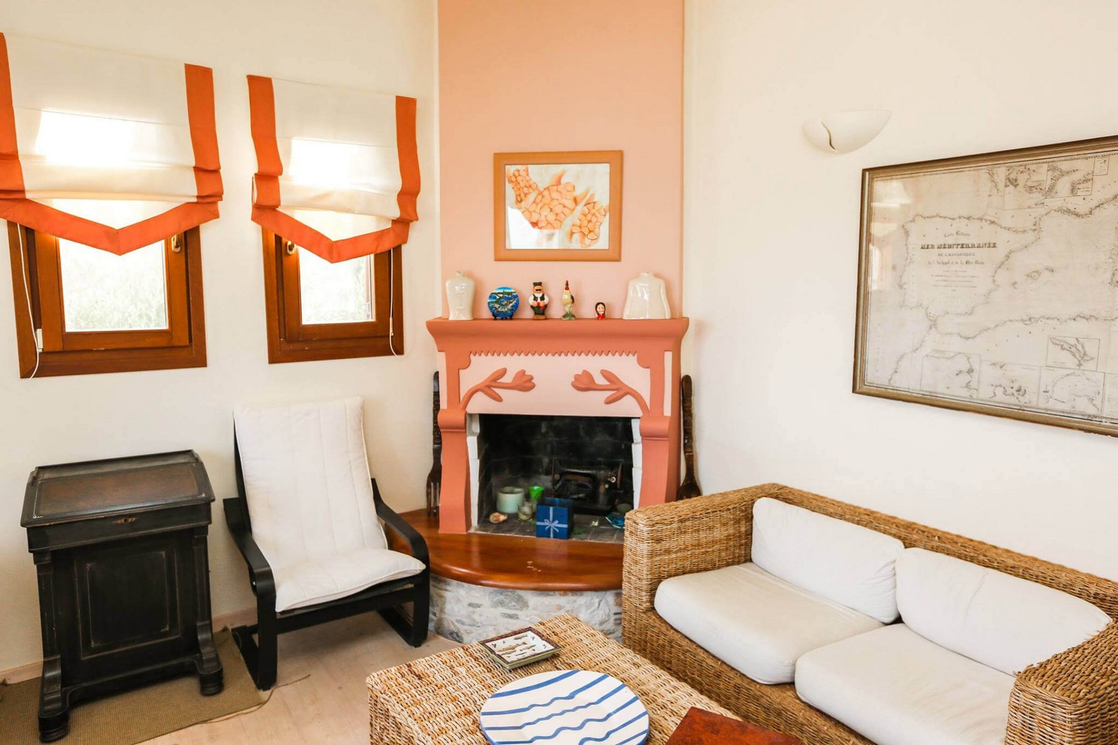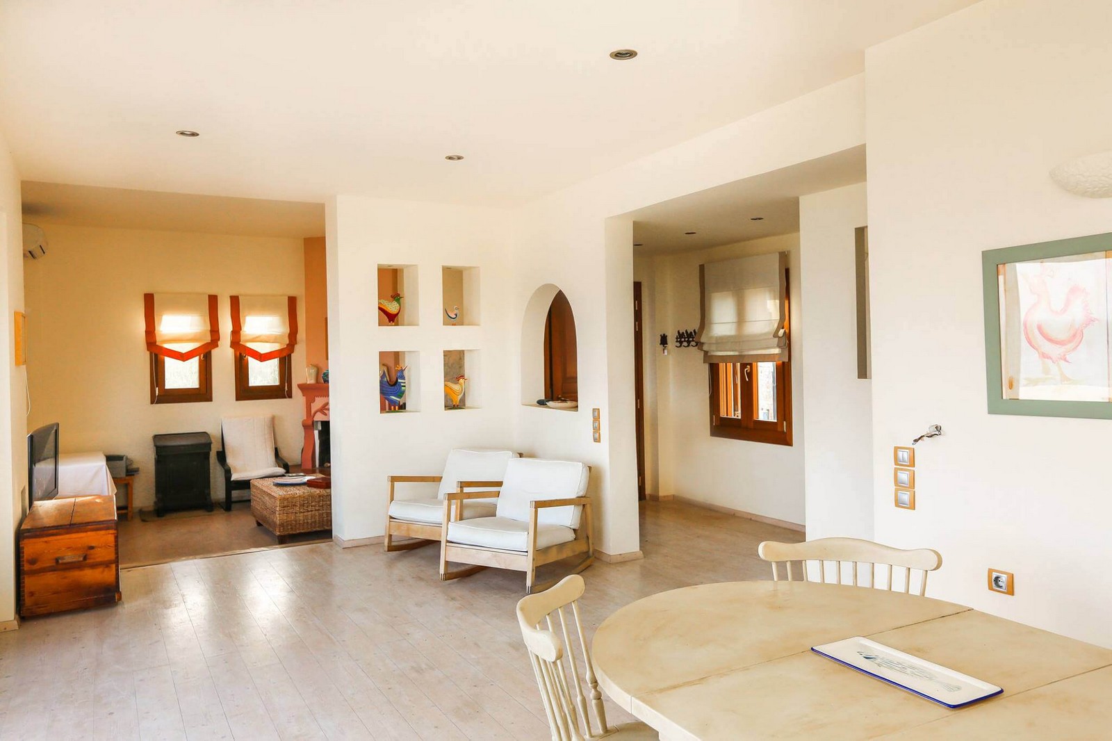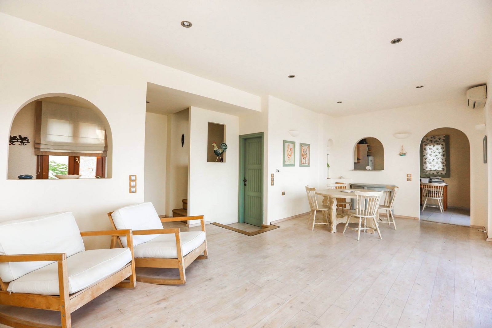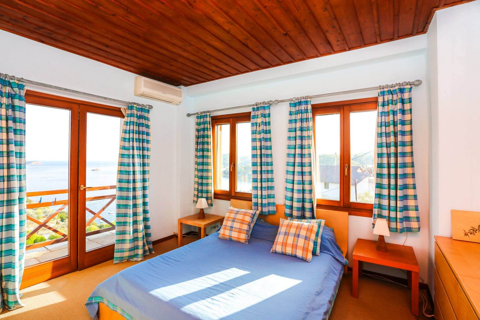 On the ground floor, there is a spacious sitting/dining room, fireplace nook, large kitchen, guest bathroom and a 180m2 sea facing terrace with a stone built bbq. The view from the terrace is panoramic and quite stunning.