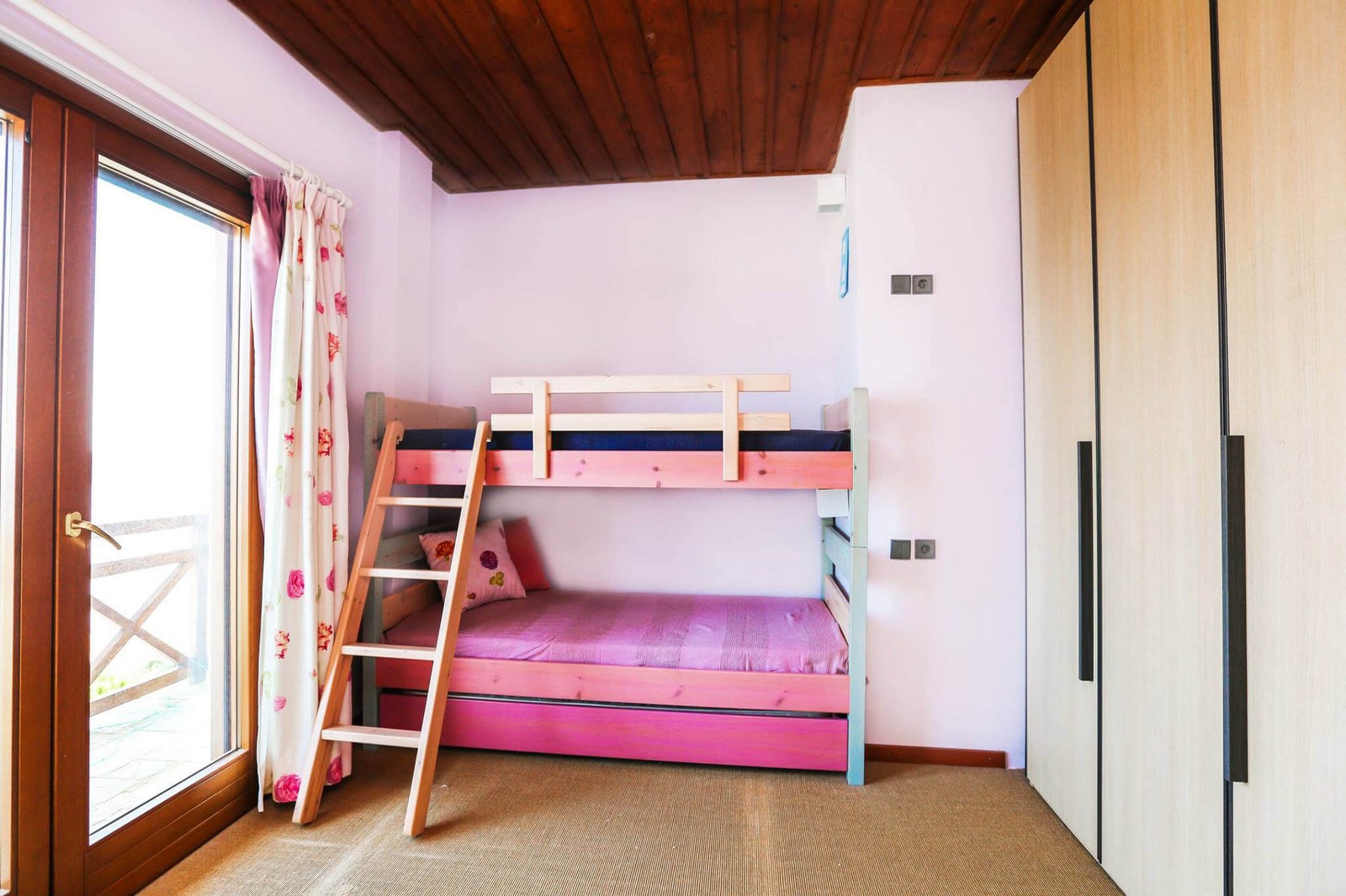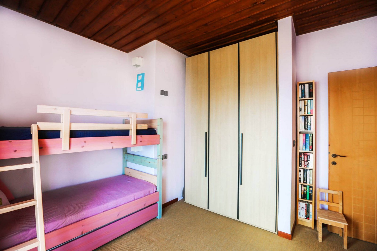 On the upper floor, there are three bedrooms each with their own en-suite bathroom. Two have double beds and the third has bunk beds and an extra trundle bed. There is also a small utility area with a washing machine and dryer.