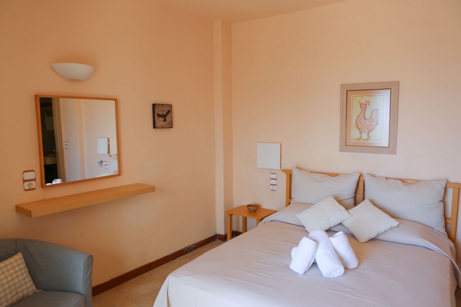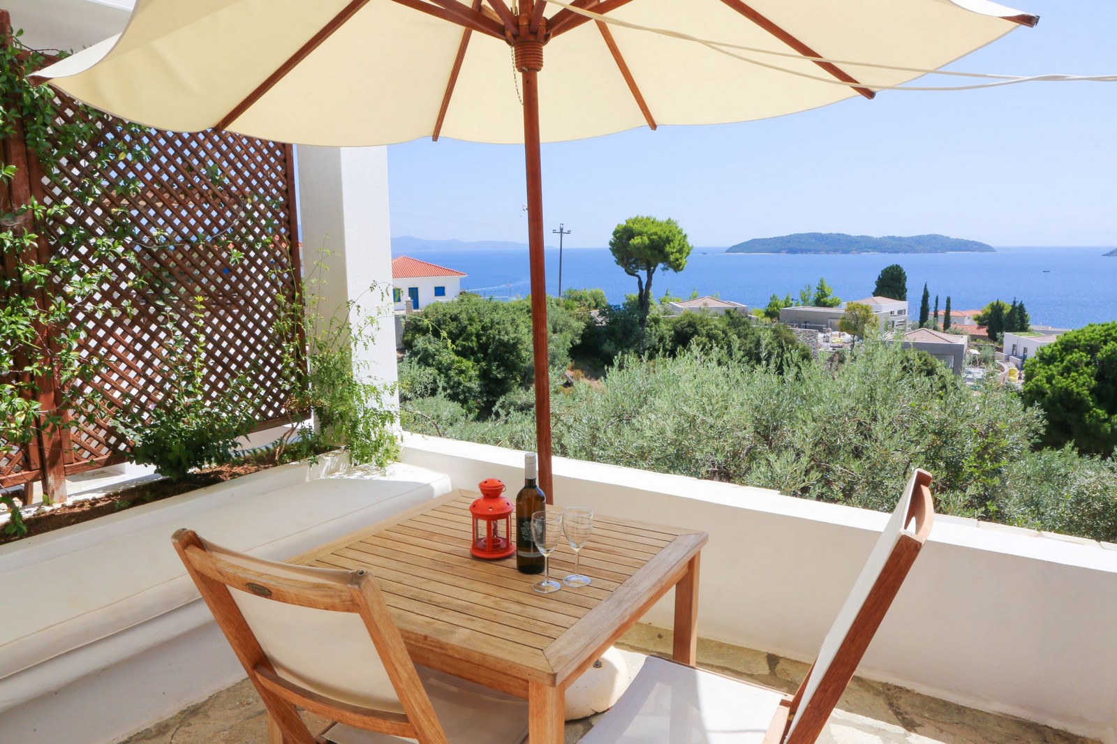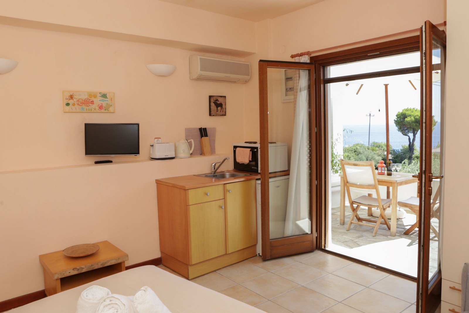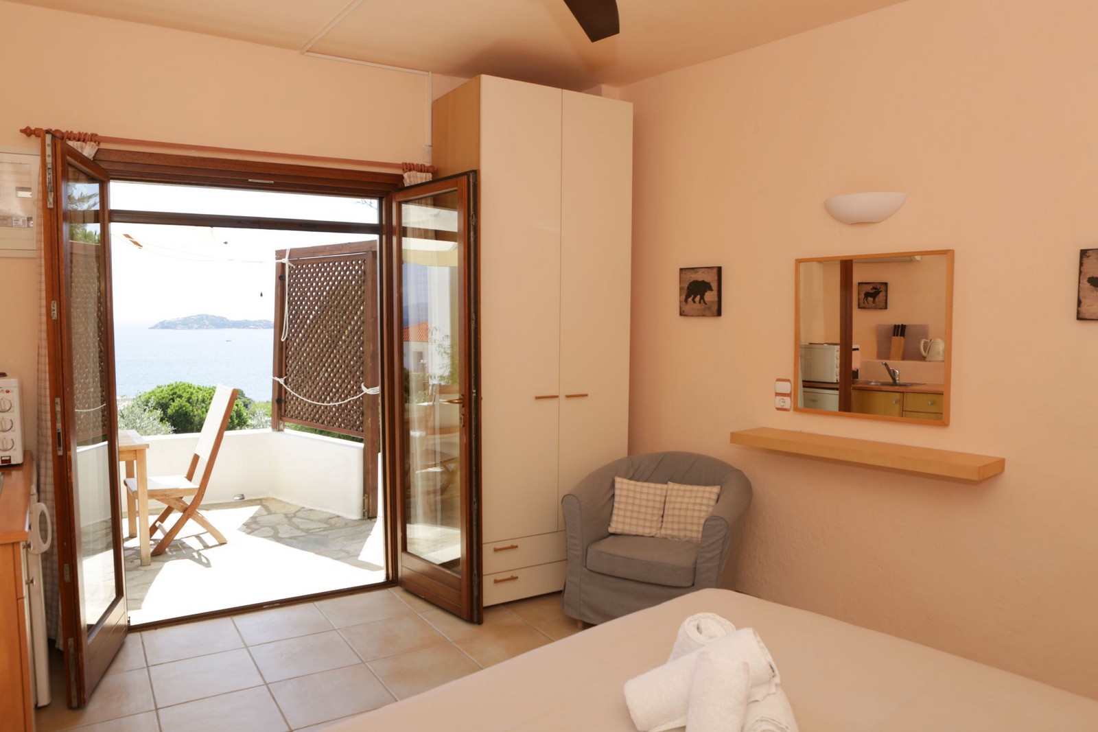 Our smallest studio, which is one of the cosiest units in the complex, is perfect for a couple. The kitchenette, though small, is fully equipped and the powerful but silent ceiling fan has proved very popular. The sea facing terrace offers a built-in sofa for relaxing along with a dining table ideal for two! This unit sleeps two adults.